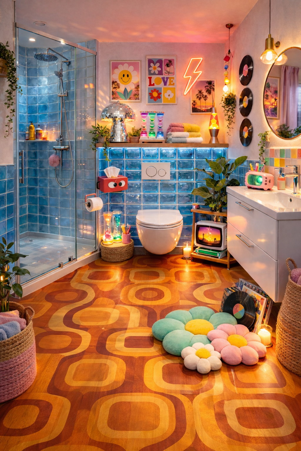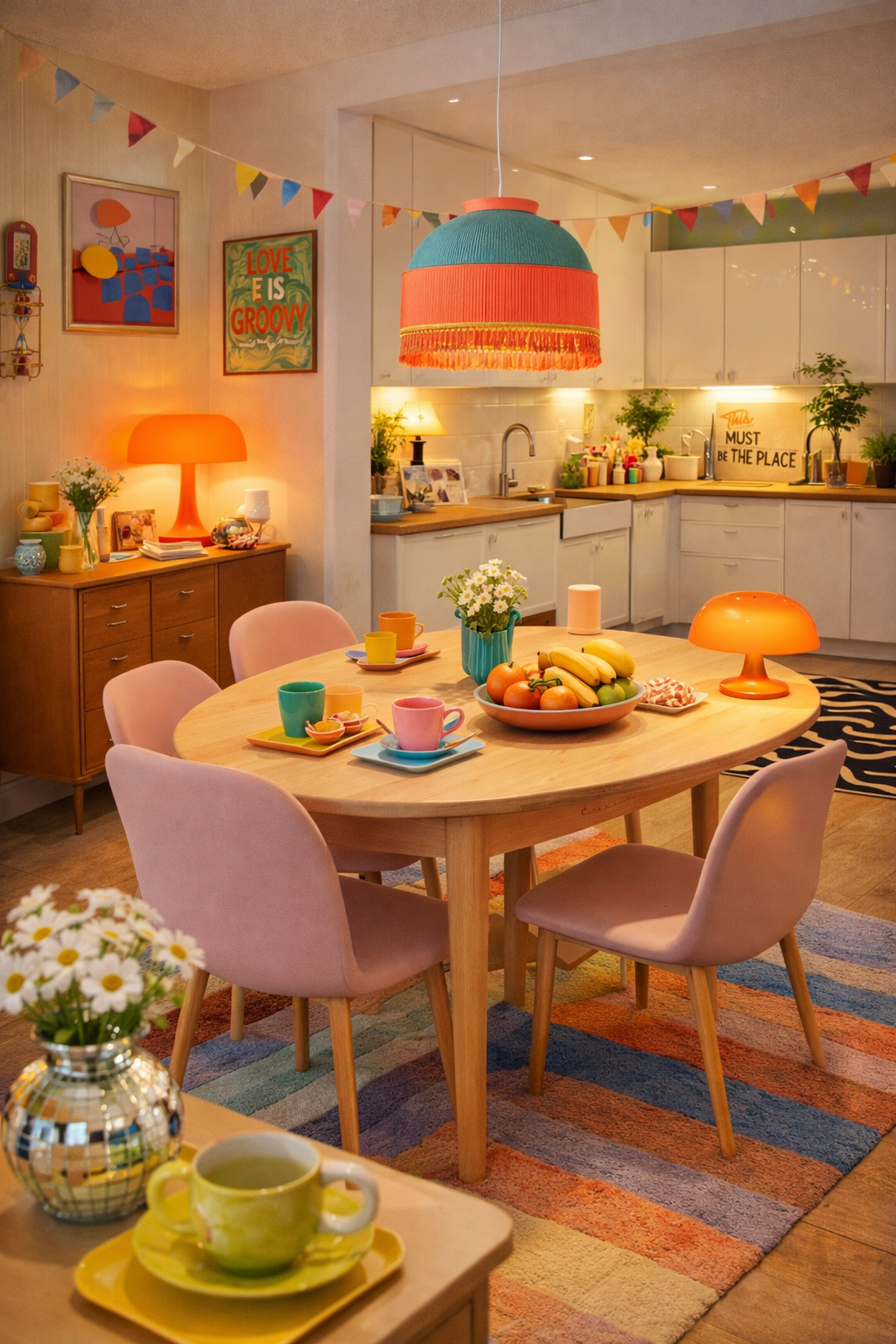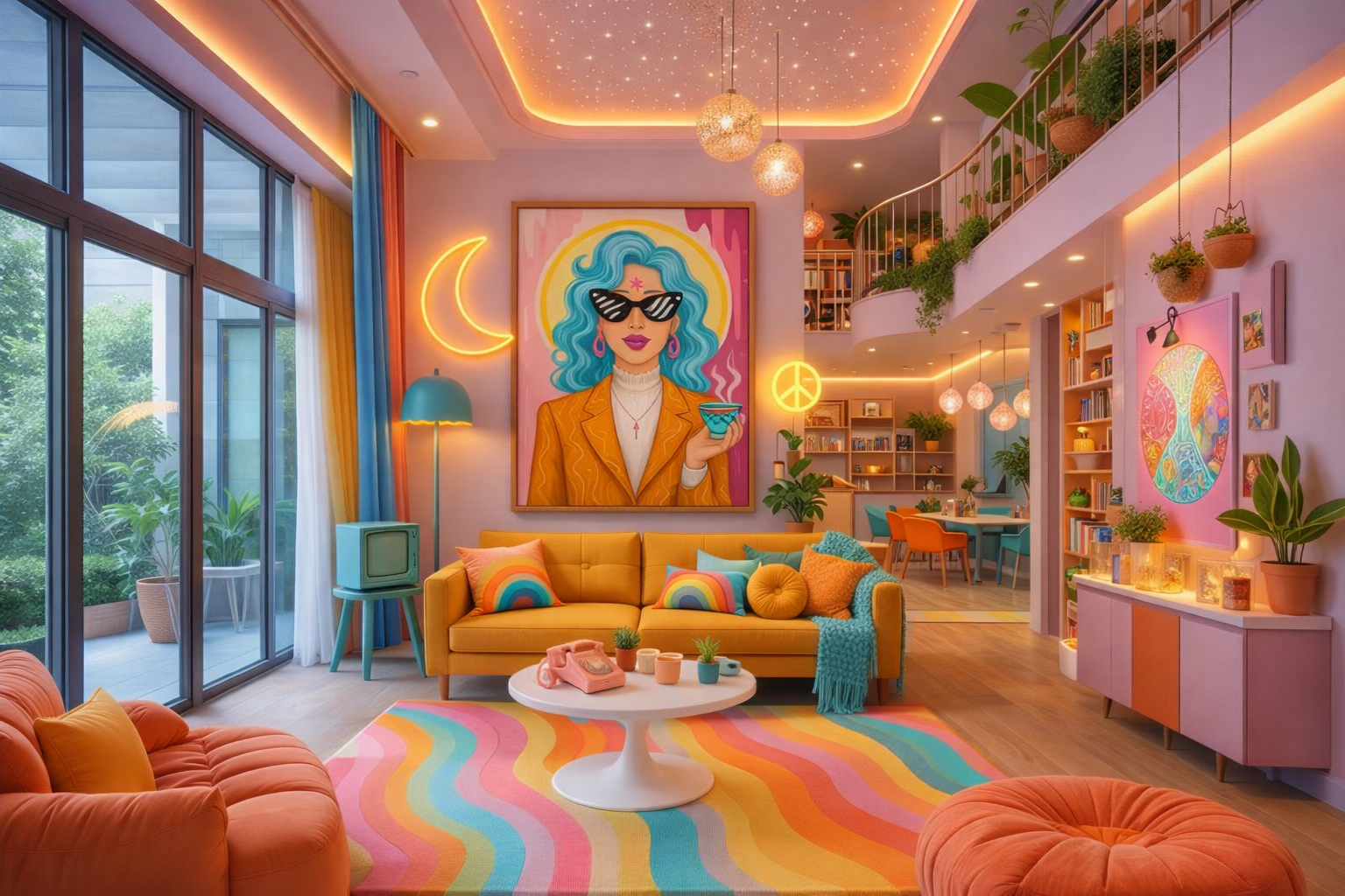 Nos inspiramos en los años 70 y 90 , vibraciones pop, interiores coloridos , luces de neón y objetos icónicos .