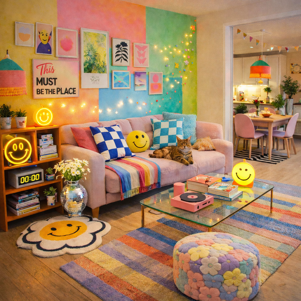 Una alfombra de arcoíris puede transformar un rincón cotidiano en una zona que mejora el estado de ánimo .